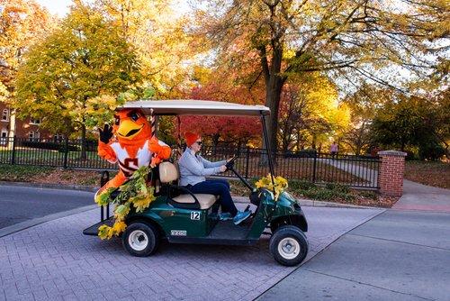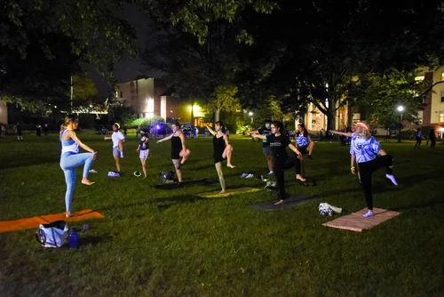 Bride and groom walking in front of fountain at Priestley-Savidge House.